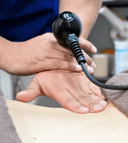 筋肉や脂肪層まで奥深く届くラジオ波(0.3~0.5MHz)という高周波によって、体内の水分や細胞分子などを振動させてジュール熱(摩擦熱)を発生させ、体全体の温度を内側から上昇させることで代謝が活性化します。これにより手技では届かない体の深部の頑固なはりや凝り、痛みといった筋緊張を効率よく施術、改善することができます。
